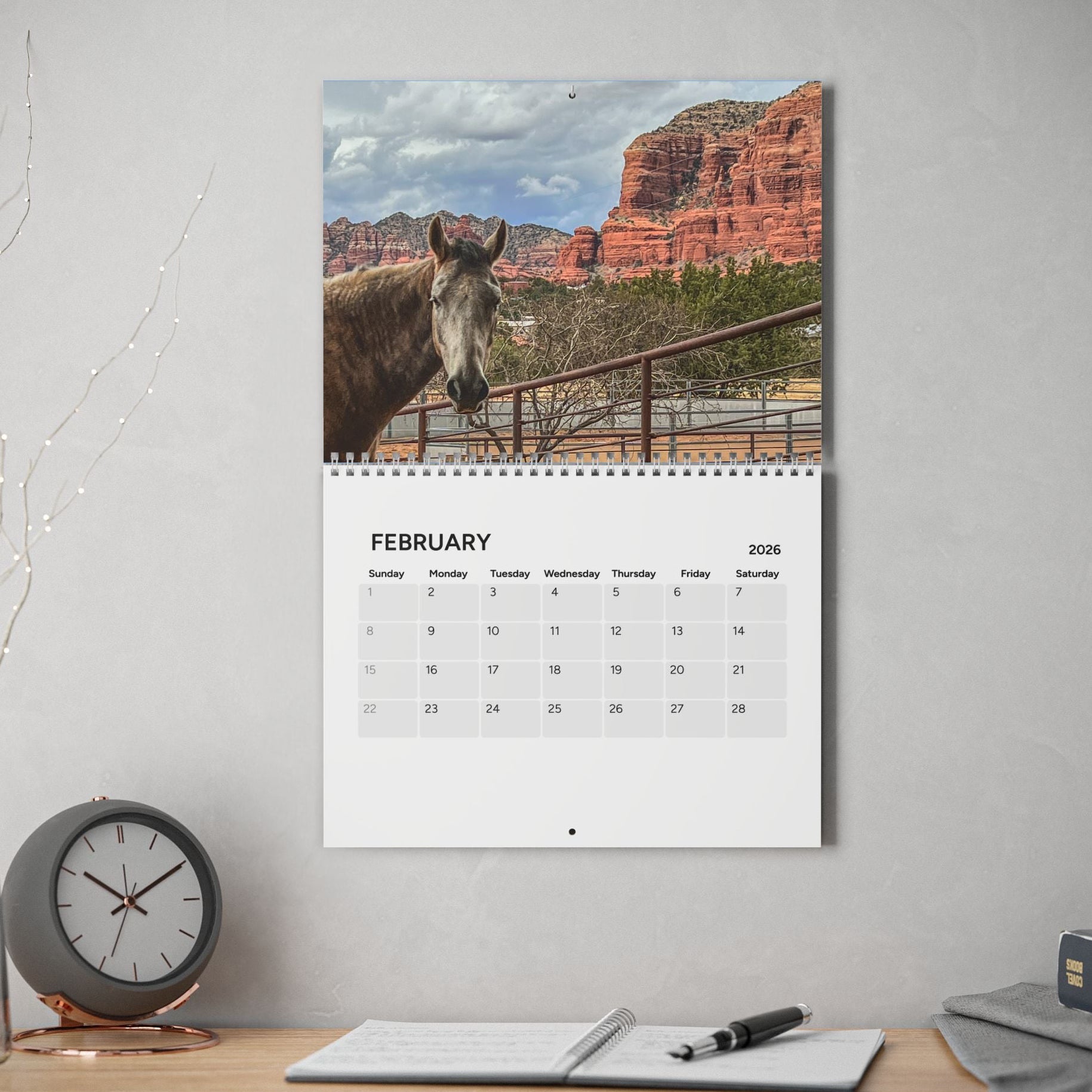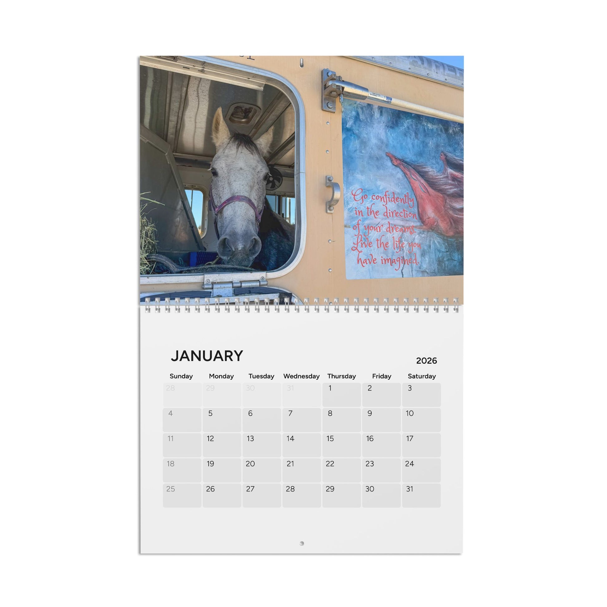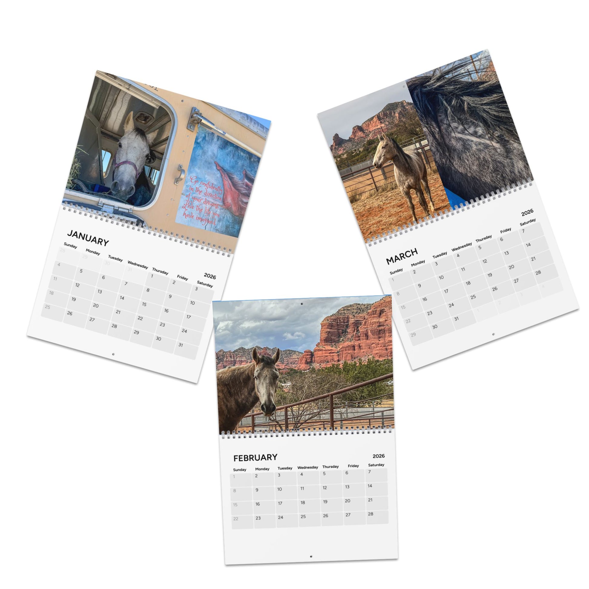 A fundraising calendar for mustang Dreamer showcasing her first year in Sedona Arizona, Cody Wyoming and the travel between. The calendar gives off a peaceful and adventurous vibe, perfect for horse lovers, Dreamers supporters and fans of the American West. Ideal for those looking to keep track of dates in a unique and meaningful way, relevant for equestrians, nature enthusiasts, and travelers.